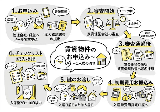 3)審査通過 無事に審査が通れば、いよいよお部屋の確保が確定です。ここから契約書類の準備や、引越し日(入居日)の最終調整に入ります。